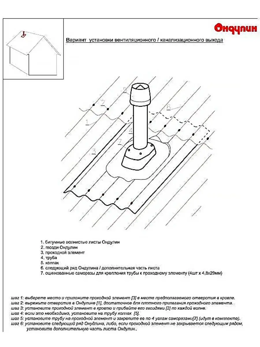 Для монтажа необходимо обеспечить нахлёсты не менее 12 см, основание (проходной элемент) закрепить гвоздями по каждой волне, а трубу установить вертикально по уровню и крепить саморезами из комплекта.